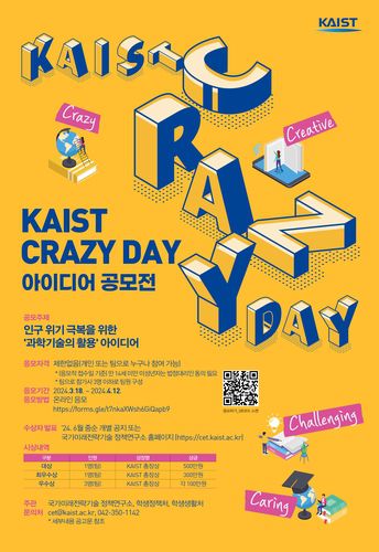 (대전=연합뉴스) 정찬욱 기자 = 한국과학기술원(KAIST)은 국가적 과제인 인구 위기를 과학기술 아이디어로 해결하기 위한 대국민 아이디어 공모전(KAIST Crazy Day 아이디어 공모전)을 개최한다고 15일 밝혔다.