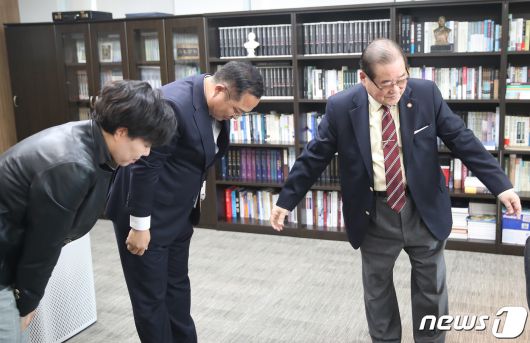 (서울=뉴스1) 임세영 기자 = 조수연 국민의힘 예비후보(대전 서구갑)와 부인이 15일 오후 서울 여의도 광복회에서 이종찬 광복회장을 만나 일제강점기를 옹호하는 취지의 글을 올린 것을 사죄하고 있다. 조 후보는 지난 2017년 자신의 페이스북에 "백성들에게는 봉건왕조의 지배보다 일제강점이 더 좋았을지도 모른다"라는 글을 게재해 논란을 일으켰다. 2024.3.15/뉴스1