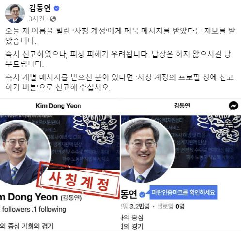 김 지사는 본인의 페이스북 계정과 사칭 계정을 비교한 사진을 게시하기도 했다.