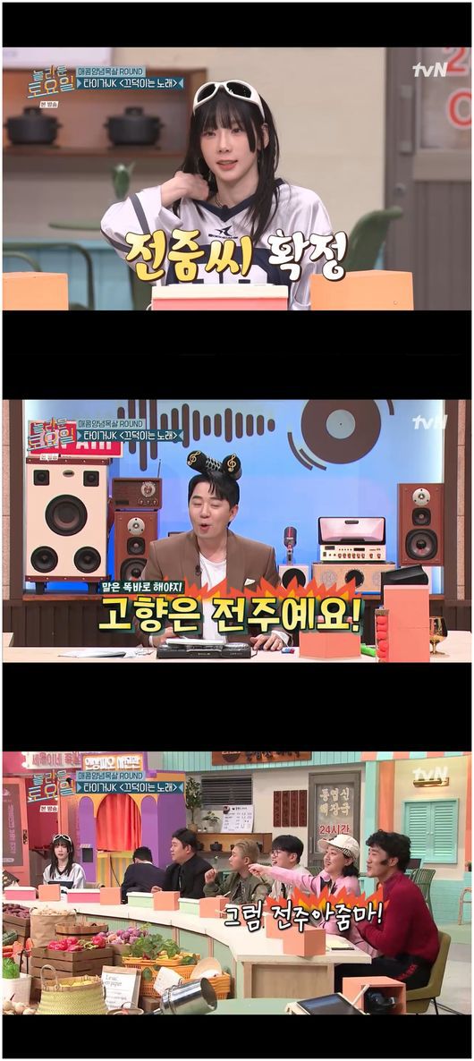 이에 "아줌마라뇨"라며 사방에서 아우성이 일었다. 태연은 사랑스럽게 뾰로통한 표정이 되었다. 붐은 "태연 고향은 전주다"라고 말했고, 김동현은 "그럼 전주 아줌마"라고 말했다. 이에 박나래는 "전줌씨, 이렇게 하죠"라고 말해 태연의 별명은 졸지에 '전주아줌마씨'를 줄인 '전줌씨'가 되었다./osen_jin0310@osen.co.kr