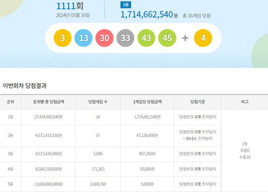 이날 당첨번호 조회 결과에 따르면 1111회 로또복권 1등 당첨번호 6개는 '3, 13, 30, 33, 43, 45'로 나타났다. 1등에 당첨된 이들은 각각 17억1466만원을 받는다.