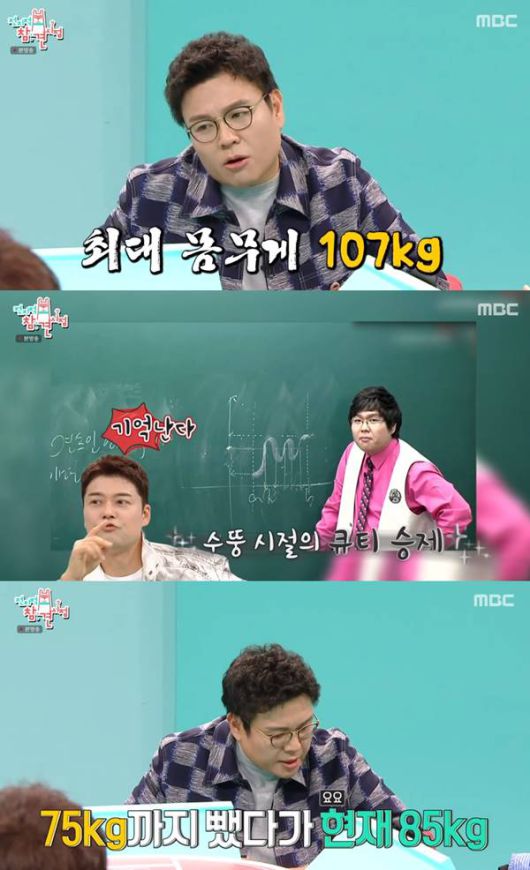 얼마나 빠진 것이냐고 묻자, 정승제는 "제일 많이 나갈 때는 107kg까지 나가고 그랬다. 75kg까지 만들었는데 다시 쪄서 지금은 85kg 정도 되는 거 같다"고 밝혔다.