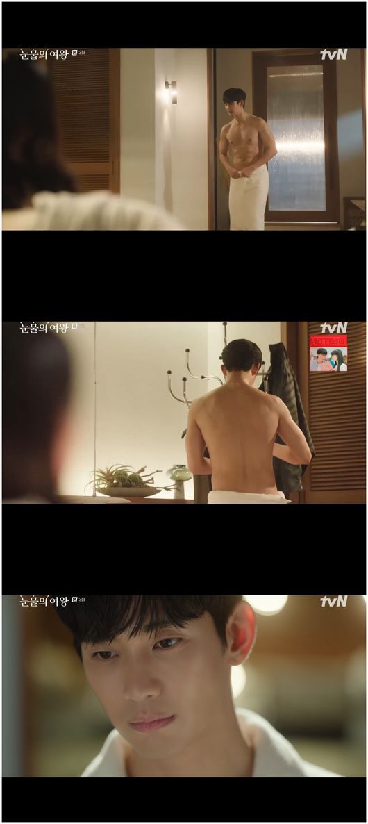 16일 방영한 tvN 새 토일드라마 ‘눈물의 여왕’(극본 박지은/ 연출 장영우, 김희원/ 제작 스튜디오드래곤, 문화창고, 쇼러너스)에서는 재벌상속녀 홍해인(김지원 분)의 마음을 설레게 한 그의 남편이자 변호사 백현우(김수현 분)의 완벽한 몸메가 공개됐다.