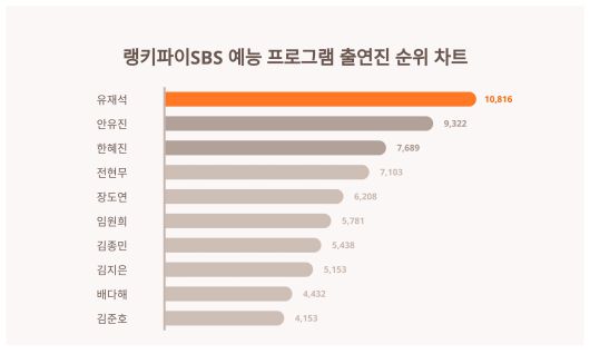 순위 키워드 3월 1주차 2월 4주차 증감 비율 1 유재석 10,816 11,567 -751 -6.5% 2 안유진 9,322 11,898 -2,576 -21.7% 3 한혜진 7,689 6,677 1,012 15.2% 4 전현무 7,103 8,800 -1,697 -19.3% 5 장도연 6,208 3,695 2,513 68.0% 6 임원희 5,781 3,763 2,018 53.6% 7 김종민 5,438 4,556 882 19.4% 8 김지은 5,153 7,008 -1,855 -26.5% 9 배다해 4,432 1,078 3,354 311.1% 10 김준호 4,153 4,548 -395 -8.7% [출처: 랭키파이 인물 SBS 예능 프로그램 출연진 트렌드 테이블]