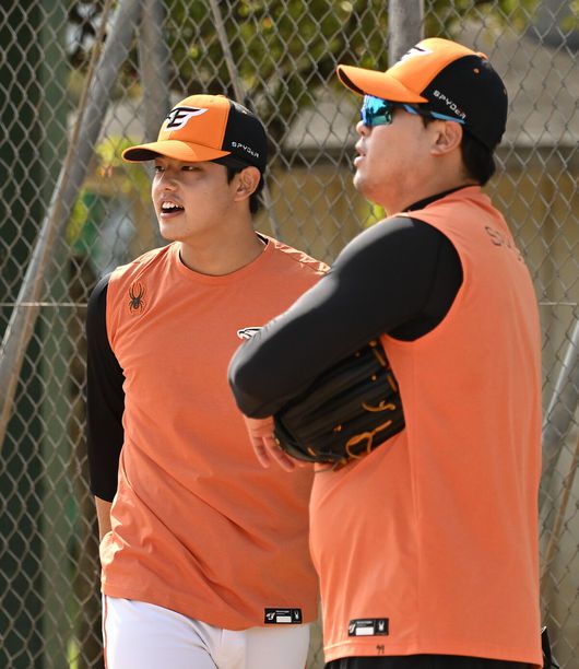 [OSEN=대전, 최규한 기자] 프로야구 한화 이글스가 2024 시즌을 앞두고 7일 대전 한화생명이글스파크에서 자체 평가전을 가졌다.평가전을 앞두고 한화 선발 류현진과 문동주가 불펜에서 몸을 풀고 있다. 2024.03.07 / dreamer@osen.co.kr |