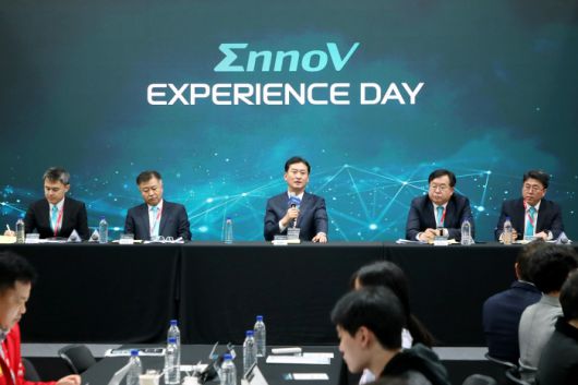 15일 화성 자동차안전연구원(KATRI)에서 EnnoV Experience Day 행사에서 정일택 금호타이어 대표이사 사장과 관계자들이 질의응답을 하고 있다. 사진=금호타이어 제공 |