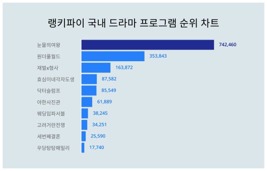 순위 키워드 3월 17일 3월 16일 증감 비율 1 눈물의여왕 742,460 328,910 413,550 125.7% 2 원더풀월드 353,843 228,056 125,787 55.2% 3 재벌x형사 163,872 94,165 69,707 74.0% 4 효심이네각자도생 87,582 12,891 74,691 579.4% 5 닥터슬럼프 85,549 31,227 54,322 174.0% 6 야한사진관 61,889 47,388 14,501 30.6% 7 웨딩임파서블 38,245 32,611 5,634 17.3% 8 고려거란전쟁 34,251 17,710 16,541 93.4% 9 세번째결혼 25,590 76,724 -51,134 -66.6% 10 우당탕탕패밀리 17,740 24,064 -6,324 -26.3% [출처: 랭키파이 국내 드라마 프로그램 트렌드 테이블]