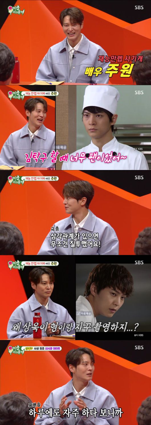 '과몰입 장인'으로 상대 여배우에게 질투를 느낀 적이 많다는 주원은 누구에게 가장 큰 질투를 느꼈냐는 MC 서장훈의 질문에 "삼각관계가 있으면 무조건 질투를 했다. (문)채원 누나랑 같이 '굿닥터'를 할 때 (주)상욱이 형이랑 채원 누나랑 촬영 분량이 많아서 질투했다"라고 대답해 눈길을 끌었다.