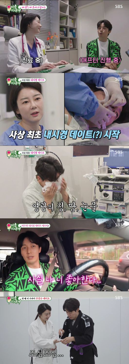 한편 허경환은 소개팅 상대와 두 번째 만남에 성공했다. 김종민이 선물한 12cm 높이의 키높이 신발을 신고 소개팅 상대가 일하는 병원에 위내시경 검사를 하러 방문한 허경환은 건강검진 문진을 진행하며 거꾸로 상대에게 질문을 던지며 어필하는 적극적인 모습을 보였다.