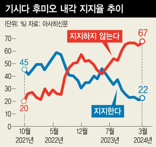아사히신문은 16~17일 전화 여론조사(응답자 1065명) 결과, 기시다 내각의 지지율이 한달 전보다 1%포인트 오른 22%로 나타났다고 보도했다. 지난해 10월(29%) 이후 20%대 지지율을 6개월째 벗어나지 못하고 있는 것이다. “지지하지 않는다”는 부정 평가는 67%로 자민당이 정권을 되찾은 2012년 이후 최고치를 기록했다.