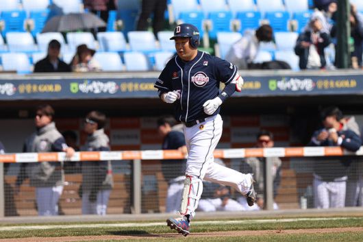 두산 양의지가 18일 대전 한화전 시범경기에서 홈런을 친 뒤 베이스를 돌고 있다. /두산 베어스 제공 |