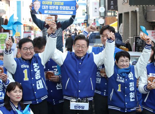 더불어민주당 이재명 대표가 14일 오전 대전 중구 으능정이 거리를 방문해 시민들에게 지지를 호소하고 있다. (사진=연합뉴스 제공) |