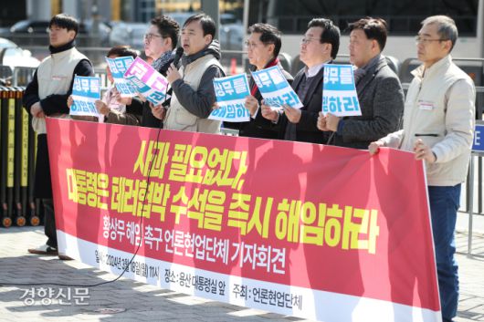 ‘언론인 회칼 테러’ 발언으로 논란을 빚은 황상무 대통령실 시민사회수석비서관에 대한 언론현업단체들의 사퇴 촉구가 이어지고 있다.