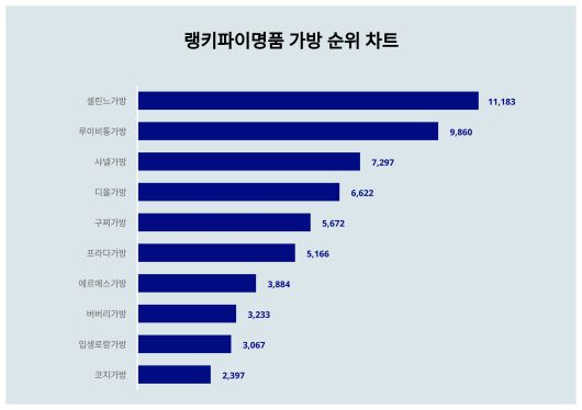 순위 키워드 트렌드지수 남성 여성 1 셀린느가방 11,183 13% 87% 2 루이비통가방 9,860 17% 83% 3 샤넬가방 7,297 22% 78% 4 디올가방 6,622 19% 81% 5 구찌가방 5,672 16% 84% 6 프라다가방 5,166 16% 84% 7 에르메스가방 3,884 22% 78% 8 버버리가방 3,233 13% 87% 9 입생로랑가방 3,067 15% 85% 10 코치가방 2,397 12% 88% [출처: 랭키파이 패션/잡화 명품 가방 트렌드 테이블]