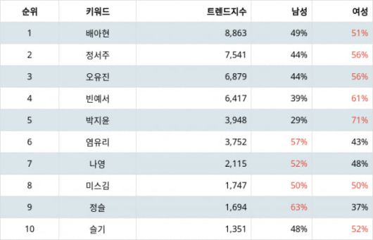 성별 선호도 분석 결과 1위 배아현은 남성 49%, 여성 51%, 2위 정서주는 남성 44%, 여성 56%, 3위 오유진은 남성 44%, 여성 56%가 선호하는 것으로 나타났다.
