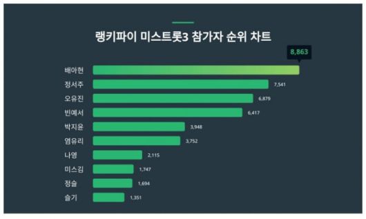 3월 3주차 미스트롯3 참가자 랭키파이 분석 결과 1위를 차지한 배아현은 트렌드 지수 8,863포인트로 전주보다 13,069포인트 하락했다.