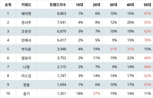 연령별 선호도에서는 배아현이 10대 1%, 20대 6%, 30대 10%, 40대 15%, 50대 67%로 나타났다.