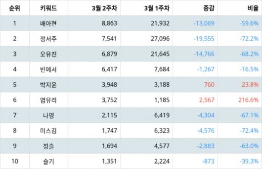 정서주는 7,541포인트로 전주보다 19,555포인트 하락해 2위를 차지했다.