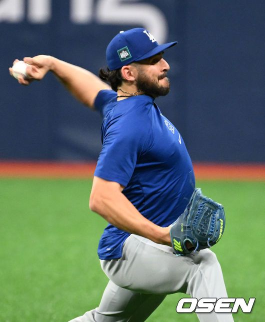 [OSEN=고척, 이대선 기자] 19일 서울 고척스카이돔에서 ‘메이저리그 월드투어 서울 시리즈 2024’ LA 다저스 공식 훈련이 진행됐다. LA 다저스 나빌 크리스맷이 캐치볼을 하고 있다. 2024.03.19 /sunday@osen.co.kr