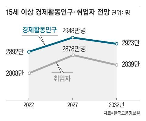 한국고용정보원은 19일 이 같은 내용의 ‘중장기(2022~2032년) 인력수급 전망 및 추가 필요 인력 전망’을 발표했다. 이에 따르면 오는 2032년까지 늘어날 것으로 예상되는 15세 이상 전체 경제활동인구는 31만6000명이다. 하지만 이는 지난 10년(2012~2022년)간 경제활동인구 증가폭(314만1000명)의 약 10분의 1 수준에 불과하다. 우리나라 15세 이상 전체 경제활동인구 수는 2027년 2948만5000명으로 정점을 찍은 뒤 2032년 2923만8000명으로 약 24만7000명 줄어든다는 게 고용정보원의 설명이다. 15~64세 경제활동인구를 놓고 보면 더 일찍 감소세가 시작돼 2027년까지 65만7000명이 줄어드는 데 이어, 2032년까지 모두 170만3000명이 감소한다. 이 영향으로 15세 이상 취업자도 2027년 2878만9000명으로 정점을 찍은 2032년에는 2839만9000명으로 내려갈 전망이다.
