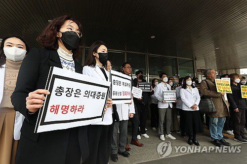 '의대정원 증원 신청 철회하라'(청주=연합뉴스) 김형우 기자 =19일 오후 충북대 대학본부에서 이 대학 의대 교수들이 의대정원 증원 신청 철회를 요구하며 시위를 열고 있다. 2024.3.19 vodcast@yna.co.kr ▶제보는 카카오톡 okjebo▶연합뉴스 앱 지금 바로 다운받기~▶네이버 연합뉴스 채널 구독하기<저작권자(c) 연합뉴스, 무단 전재-재배포, AI 학습 및 활용 금지>