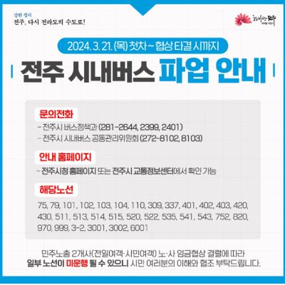 20일 전주시에 따르면 민주노총 공공운수노조 민주버스본부 전북지부는 전일여객·시민여객과의 2024년 임금 협상이 결렬됨에 따라 오는 21일부터 파업을 예고했다.