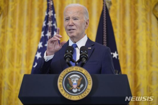 [워싱턴=AP/뉴시스] 조 바이든 미국 대통령이 18일(현지시각) 백악관 이스트룸에서 열린 '여성 역사의 달' 행사에 참석해 연설하고 있다. 바이든 대통령은 "재생산의 자유는 투표용지에 달려있다"라며 임신중절(낙태)권 회복을 위한 여성 유권자들의 지지를 당부했다. 2024.03.19. |