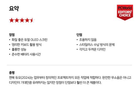 최신 아수스 젠북 듀오 2024년형은 화면이 2개 달려 있어 콘텐츠 제작에 이상적이다. 추가 화면 덕분에 풀사이즈 키보드를 사용하면서 작업 공간을 확장할 수 있다. 제품 컨셉만 보면 레노버 요가 북 9i와 비슷하지만 더 크고 강력하다. MIL-STD-810H 내구성 테스트를 통과했으므로 일상 생활에서 다소 거칠게 사용해도 충분히 견딘다. 무엇보다 다른 고성능 투인원 제품과 비교해도 무겁지 않다. 개인적으로는 디자인이 너무 각진 것이 아쉽지만 전반적으로는 꽤 괜찮은 제품이다.