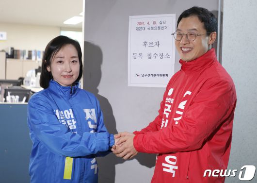 (울산=뉴스1) 김지혜 기자 = 더불어민주당 전은수 후보(왼쪽)와 국민의힘 김상욱 후보가 21일 울산선거관리위원회에서 제22대 총선 울산 남구갑 후보자 등록을 하고 나와 악수를 하고 있다. 2024.3.21/뉴스1joojiok@news1.krCopyright ⓒ 뉴스1. All rights reserved. 무단 전재 및 재배포, AI학습 이용 금지.