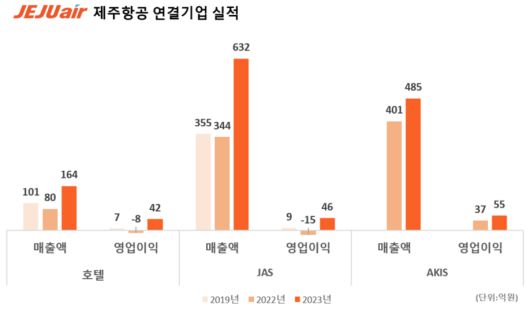 21일 제주항공에 따르면 2023년 연결 기준 1조7240억원의 매출액과 1698억원의 영업이익을 기록했다. 제주항공의 항공운송사업은 1조6993억원의 매출과 1618억원의 영업이익을 나타냈다. 제주항공의 자회사인 호텔사업, 제이에이에스(JAS), 에이케이아이에스(AKIS)는 각각 164억원, 632억원, 485억원으로 역대 매출을 달성했다.