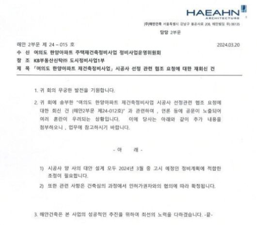 아시아투데이 전원준 기자 = 여의도 한양 아파트 재건축 사업 설계사 해안건축이 현대건설의 대안 설계안에 대해 내놓은 추가 변경 의견을 8일 만에 철회했다.