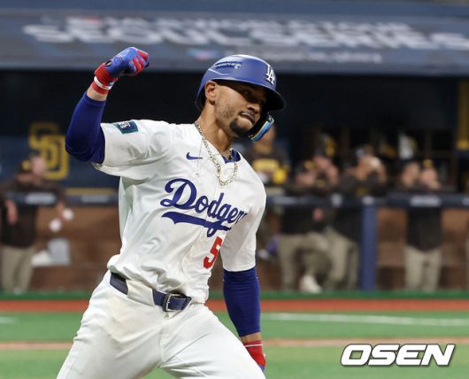 [OSEN=고척돔, 이대선 기자] 21일 오후 서울 고척스카이돔에서‘MLB 월드투어 서울 시리즈’LA 다저스와 샌디에이고 파드리스의 경기가 열렸다. 5회 다저스 무키 베츠가 좌월 2점 홈런을 날리고 그라운드를 돌고있다. 2024.03.21 /sunday@osen.co.kr