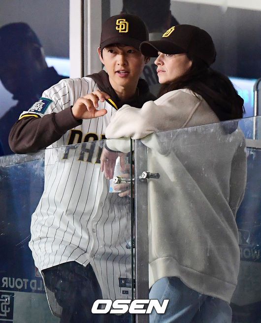 [OSEN=고척돔, 이대선 기자] 21일 오후 서울 고척스카이돔에서‘MLB 월드투어 서울 시리즈’LA 다저스와 샌디에이고 파드리스의 경기가 열렸다.배우 송중기가 아내 케이티 루이스 사운더스와 함께 경기를 관람하고 있다. 2024.03.21 /sunday@osen.co.kr |