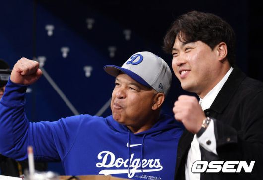 [OSEN=고척돔, 지형준 기자] 20일 오후 서울 고척스카이돔에서‘MLB 월드투어 서울 시리즈’LA 다저스와 샌디에이고 파드리스의 경기가 열렸다. 다저스 데이브 로버츠 감독과 한화 류현진이 인사를 나누고 포즈를 취하고 있다. 2024.03.20 /jpnews@osen.co.kr |