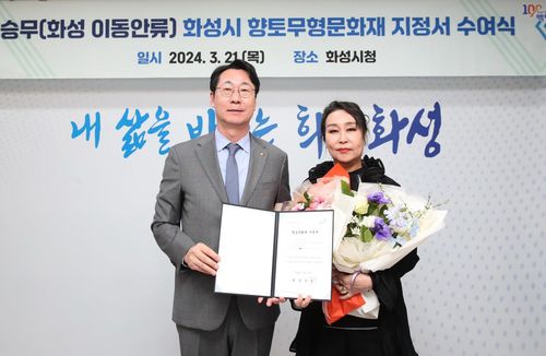 (화성=연합뉴스) 최해민 기자 = 경기 화성시는 '화성 이동안류 승무'를 향토무형문화재 제1호로 지정하고 계승자 김정아 씨에게 향토문화재 지정서를 전달했다고 22일 밝혔다.