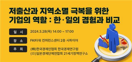 (서울=연합뉴스) 임성호 기자 = 한국경제인협회(한경협)는 게이단렌(經團連·일본경제단체연합회) 21세기정책연구소와 함께 오는 28일 서울 여의도 FKI타워에서 '저출산과 지역소멸 극복을 위한 기업의 역할: 한일 경험과 비교' 세미나를 연다고 22일 밝혔다.