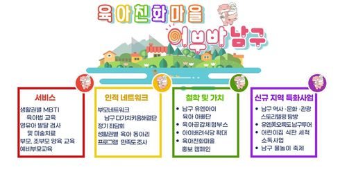 ▲유엔아이 육아아빠단, 다가치키움해결단, 생활권별 육아동아리 운영 ▲MBTI 육아교육법, 영유아 발달검사 및 심층상담, 조부모·예비부모 교육 ▲육아공감 체험부스, 아이배려식당 확대 운영 ▲남구 역사·문화·관광 스토리텔링 탐방, 유엔미 오륙도 남구투어 등이다.