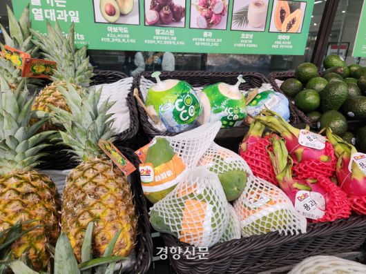 22일 서울 동대문구의 롯데마트 청량리점 과일 매대에는 코코넛, 파인애플, 파파야 같은 수입 과일이 차곡히 쌓여 있었다. 사과나 배, 참외 같은 국산 과일 대신 오렌지, 바나나가 ‘금주의 추천 상품’, ‘알뜰 기획전’ 등의 팻말을 달고 매대 한쪽을 꽉 채웠다.