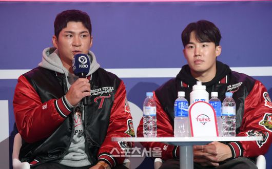 LG 트윈스 오지환(왼쪽)과 임찬규가 22일 서울 중구 소공동 롯데호텔 크리스탈볼룸에서 진행된 ‘2024 신한 SOL Bank KBO 미디어데이’ 행사에서 시즌 각오를 밝히고 있다. 2024. 3. 22. 박진업 기자 upandup@sportsseoul.com |