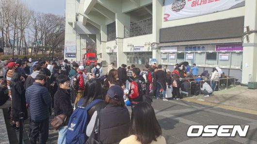 23일 오후 2시 서울 잠실구장에서 한화와 LG의 2024시즌 KBO리그 개막전이 열린다. 경기 시작 4시간이나 남은 오전 10시쯤 이미 많은 팬들이 현장 판매 티켓을 사기 위해 매표소 앞에 줄을 지어 기다리고 있었다. 100명 가까이 사람들이 모였다.