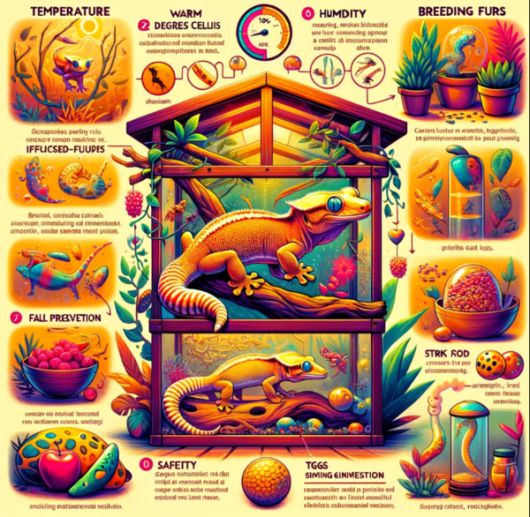 낙하 방지를 위한 안전장치 설치와 진동에 민감한 크레스티드 게코의 특성을 고려한 스트레스 관리가 필요하다. 또한, 위험을 느끼거나 스트레스를 받았을 때 꼬리를 떼어내는 자기 절단 행동을 할 수 있으므로 주의해야 한다. 암컷은 성체가 되면 무정란을 낳을 수 있고, 적절한 조건에서 수컷과의 합사를 통해 번식이 가능하다. 이때 부화기에서 알을 부화시키기 위해 일정한 온도를 유지하는 것이 중요하다.