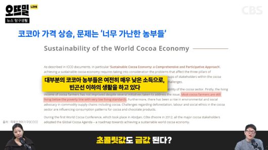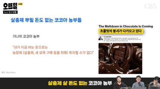 ◆ 조석영> 제가 이 이슈를 살펴보면서 알게된 포인트 하나만 더 전해드릴게요. 최근 코코아 가격 상승의 직접적인 원인이 병충해였고 농부들이 그 문제를 해결할 돈이 없는 게 구조적인 문제라고 말씀드렸잖아요.