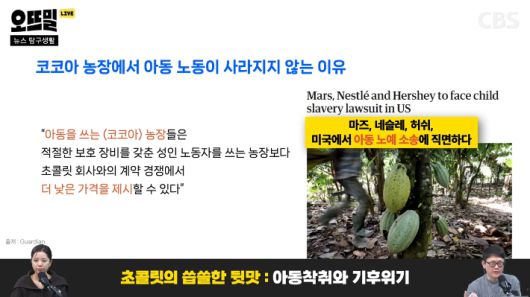 ◆ 조석영> 그렇습니다. 이 회사들도 피소된 이후에 아동 노동에 반대한다는 입장을 명확하게 밝혔어요. 그런데 과연 반대한다는 말과 실제 벌어진 일 사이의 간극이 있는 거죠. 가디언이 이 소송을 제기한 사람들의 입장을 보도했는데 '아동을 쓰는 농장들은 적절한 보호 장비를 갖춘 성인 노동자를 고용한 농장보다 초콜릿 회사와의 계약 경쟁에서 더 낮은 가격을 제시할 수 있다'는 거예요.