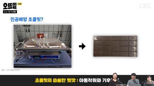 ◆ 조석영> 그래서 2021년에 스위스의 응용과학대학 연구진이 인공 코코아를 만들어서 그걸로 초콜릿을 만들었어요. 초콜릿의 환경 파괴를 막기 위한 시도라고 하는데 식감은 기존 제품과 똑같고 향은 오히려 더 강하다고 하는데 과연 상용화될 수 있을지 지켜봐야 할 것 같고요. 또 '지속 가능한 초콜릿'이라고 카카오 재배하는 농부들에게 공정한 임금을 보장하고 환경에 미치는 영향을 최소화하는 방식으로 재배하는 초콜릿이 있습니다. 대부분 공정 무역 초콜릿이 붙어 있으면 이거라고 보시면 되는데요. 좀 더 비싸긴 하지만 윤리적 소비를 하고 싶은 분들에게는 이런 선택지도 있습니다.