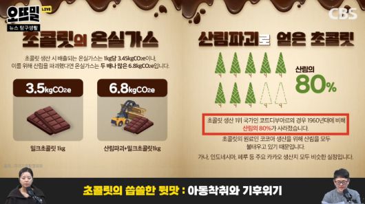 ◆ 조석영> 그러다보니 초콜릿 산업이 기후 위기에 의해서 피해를 보는 것 같잖아요. 그런데 초콜릿 산업 자체가 기후 위기를 촉발한 원인 중에 하나라는 겁니다. 전세계적으로 카카오 수요가 늘어나니까 코코아 농장이 더 필요했을 거 아니예요. 그걸 열대우림을 불태운 자리에 만든 겁니다. 코코아 원료 40% 생산하는 세계 1위 국가, 코트디부아르는 지난 50년간 카카오 나무를 심기 위한 벌목으로 열대우림의 80% 이상이 사라졌다고 합니다.