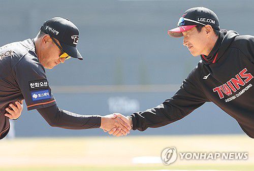인사하는 최원호-염경엽 감독 |