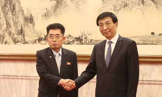 김성남 북한 국제부장(왼쪽)이 지난 21일 왕후닝 전국인민정치협상회의(정협) 주석(중국공산당 중앙정치국 상무위원) 만나 담화를 나눴다고 조선중앙통신이 보도했다. 평양=조선중앙통신·연합뉴스 |