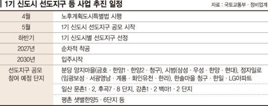 24일 정비업계에 따르면 국토교통부는 연내 지방자치단체와 노후계획도시 정비기본방침·정비기본계획을 공동으로 수립하고, 1기 신도시별로 한 곳 이상을 선도지구로 선정할 계획이다. 1기 신도시는 분당·일산·평촌·산본·중동이다. 이를 위해 5월 중 선도지구 공모에 착수하기로 했다. 선도지구로 지정되면 '노후계획도시 정비 및 지원에 관한 특별법(1기 신도시 특별법)'의 수혜를 받아 1기 신도시 중 가장 먼저 정비사업이 추진된다.