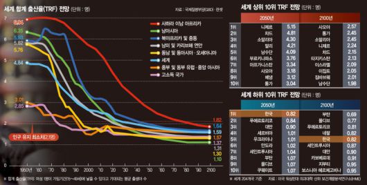 2050년 기준으로 세계 204개국 가운데 49개 국가를 제외한 나머지 약 76%의 국가들은 TFR 하락으로 인구 유지가 어려울 것으로 추정된다. 2100년에는 97%의 국가에서 인구 감소가 예상된다. 같은 시기 TFR이 2.1명을 넘어가는 국가들은 사모아, 소말리아, 통가, 니제르, 차드, 타지키스탄을 포함한 6개국이 전부다. 한국의 TFR은 2050년 0.82명으로 세계 최저로 예상되며 2100년에도 같은 수치를 유지할 것으로 보인다.
