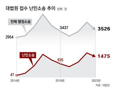 지난해 대법원에 접수된 전체 행정소송 가운데 외국인들이 ‘난민으로 인정해달라’며 낸 소송의 비율이 40%를 넘은 것으로 나타났다. 행정소송은 세금 부과나 산업재해·난민 불인정 등 정부의 행정처분이 정당한지를 다투는 절차다. 난민소송을 진행하는 동안 ‘불법체류’에서 벗어나 국내에 체류할 수 있다 보니 무분별한 소송이 이어지고 있다는 분석이 나온다.
